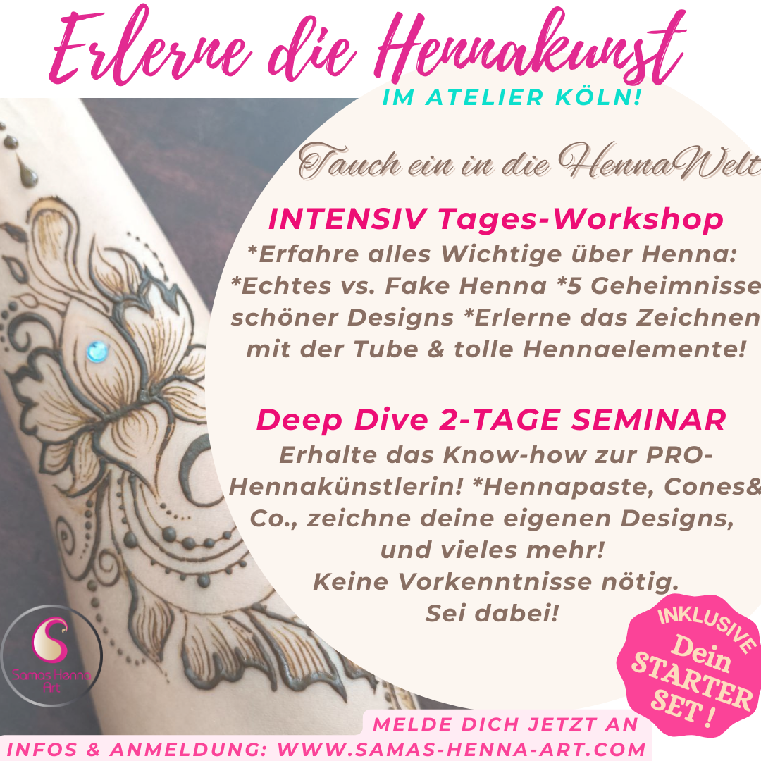 Mit viel Input, unter anderem: wie unterscheidest du echtes Henna von gesundheitsschädlichem Fake Henna!?; die Do's and Dont's für ein gelungenes Henna; das Zeichnen mit der Tube erlernen; wichtige Hennaelemente und das Malen deiner ersten eigenen Muster. - Im 2 Tage Seminar tauchst du weiter in die Hennawelt ab und erlernst alles, was du als angehende Hennakünstlerin benötigst inklusive Starterset Gold. Mit vielen Hintergrundinfos inklusive Jagua, Symbolik und anderen Themen erhältst du zum Abschluss ein Zertifikat.
